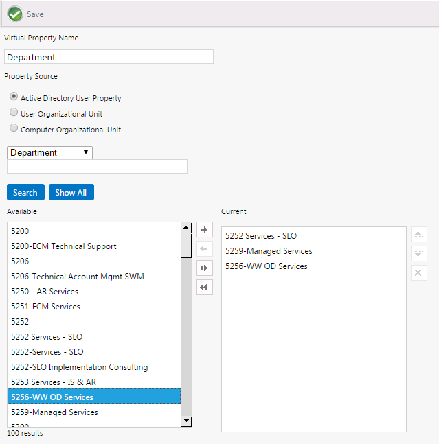 • User Organizational Unit —Select this option to extract values from a User Organizational Unit. When you select this option, a tree view of Organizational Units will be displayed in the Available area. Click and drag to move properties from the tree to the Current list.