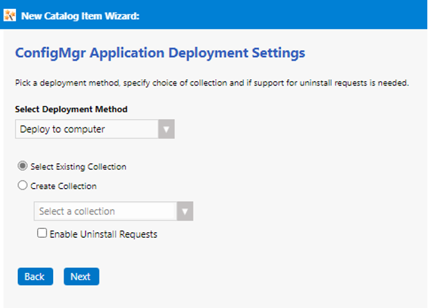 Create Uninstall CollectionSelect this option to add an uninstall collection to this catalog item. When this option is selected, users will be able to submit an uninstall request from App Portal, and System Center Configuration Manager will uninstall the application. App Portal will inform the user when the uninstall is complete.