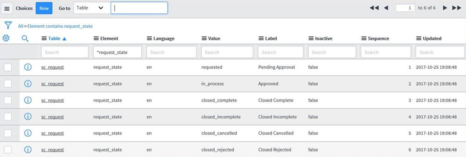 5. Use the Element column filter to filter down to *request_state to display the valid choices in the Value column that map to the desired statuses in App Portal / App Broker.