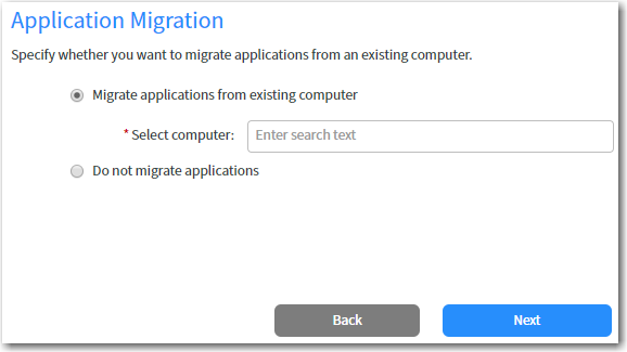 7. If you want to migrate applications from an existing computer to the target computer, select the Migrate applications from existing computer option. If you select this option, the Select computer field is displayed, where you are prompted to search for the existing computer.