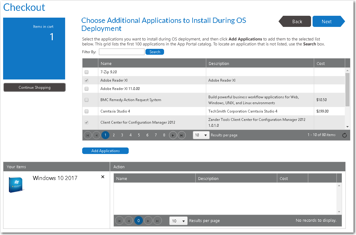 - On the Browse Catalog tab, locate an OS deployment task sequence catalog item, and click Add to add it to your cart. The Choose Target panel of the Checkout Wizard opens.