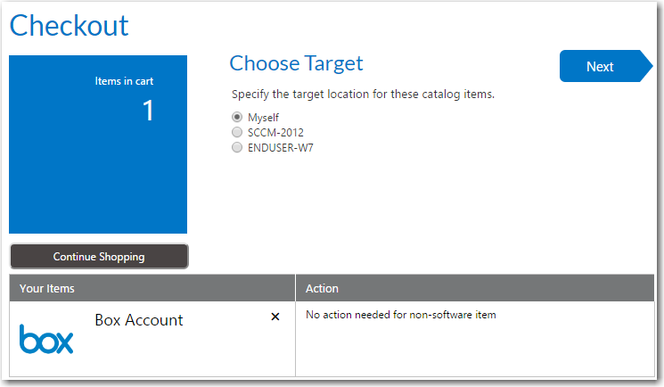 - Click View cart and checkout . The Choose Target panel of the Checkout Wizard opens.